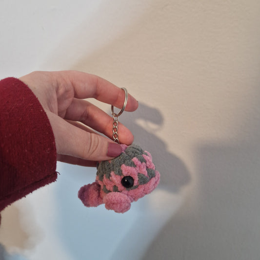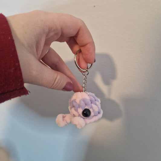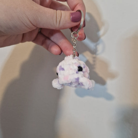 Lilac, white and pink mini whale chenille yarn crochet keyring