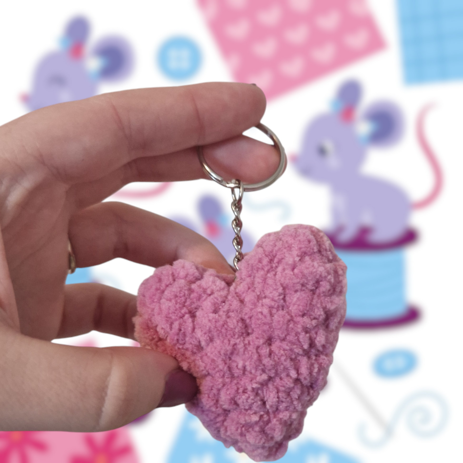 Crochet keyring made with chenille yarn, a metal keychain, stuffing and safety eyes