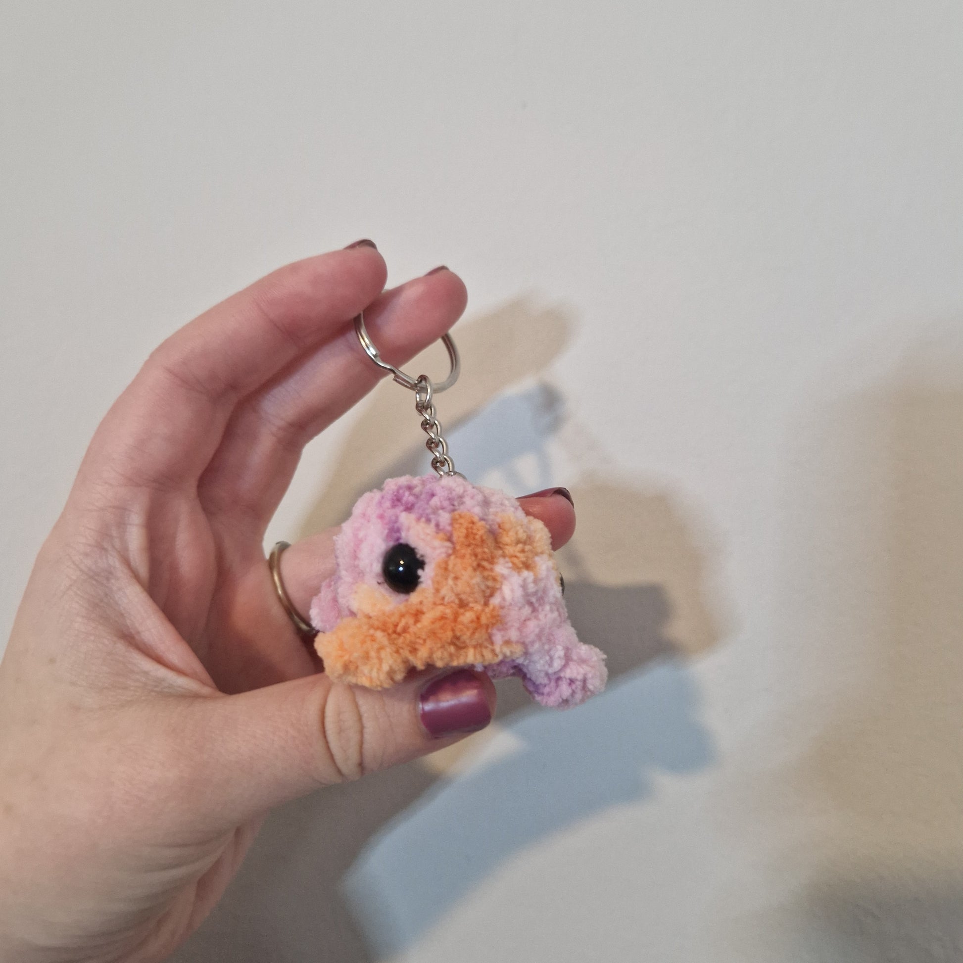 Crochet keyring made with chenille yarn, a metal keychain, stuffing and safety eyes