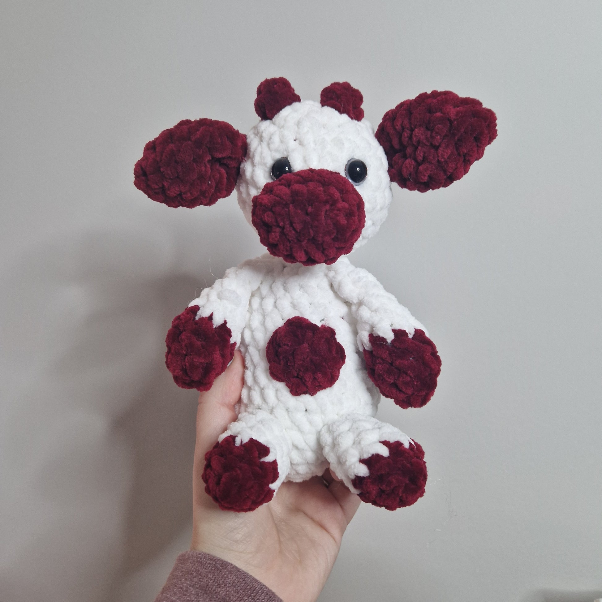 This cowis made with soft plushie yarn to give you an irresistably cuddly stuffed toy