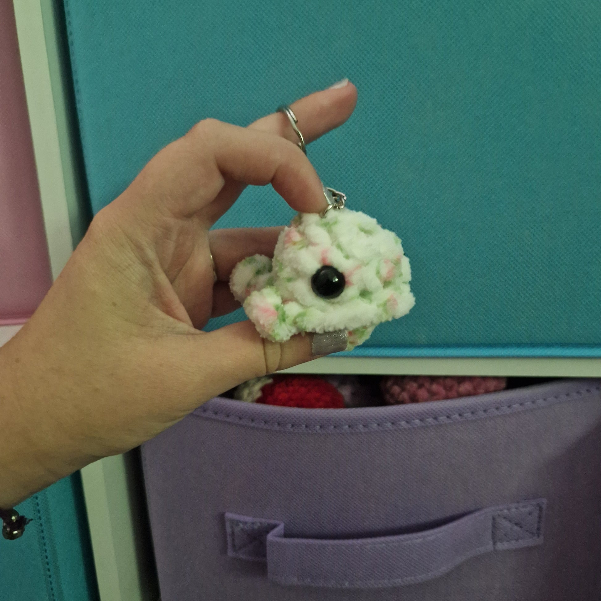 Crochet keyring made with chenille yarn, a metal keychain, stuffing and safety eyes